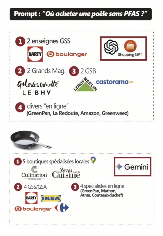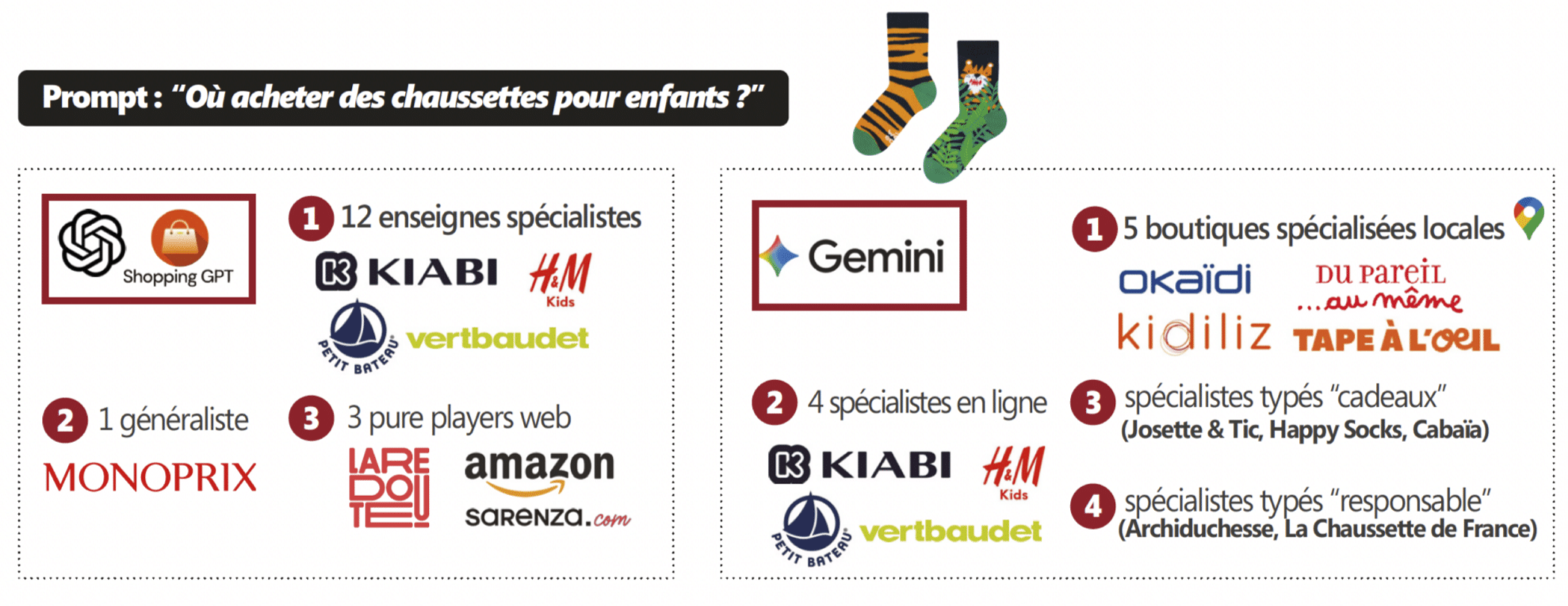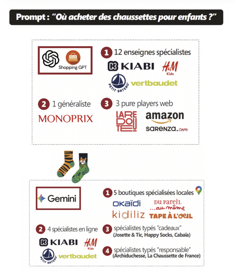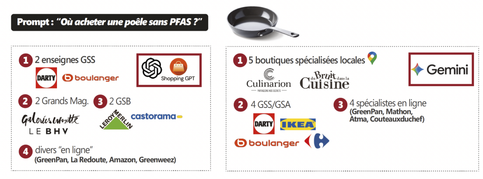 Six produits sur lesquels les GSA sont sur le papier légitimes ont été testés avec comme simple prompt “Où acheter ?” : chaussettes pour enfants, poêle sans PFAS, aspirateur sans sac, iPhone 16, ponceuse excentrique, barbecue à gaz. Résultats ? ChatGPT et Gemini privilégient systématiquement des spécialistes : Kiabi ou Verbaudet pour les chaussettes enfants, Leroy Merlin ou Castorama pour une ponceuse, etc. En “poussant” par défaut les magasins en dur, sans ignorer les achats en ligne. Y compris auprès d’enseignes ou sites très pointus si la catégorie s’y prête. Notez que le même prompt répété à 5 minutes d’intervalle ne produira pas deux fois strictement le même résultat. Mais les conclusions ne changent pas !